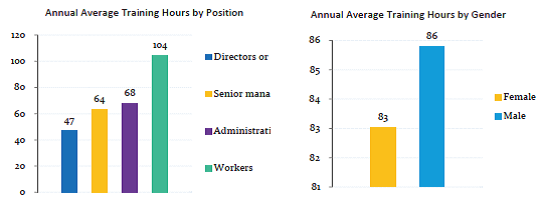 All of our employees participated in internal training courses with an annual average of 85 hours in the reporting year. Female and male staffs have slight difference (3%) in training hours they took, showing our policy that no discriminatory treatment in gender. From position aspect, frontline workers undertook more training hours, for an annual average of 104 hours, showing our priority in safety training of front-line workers.